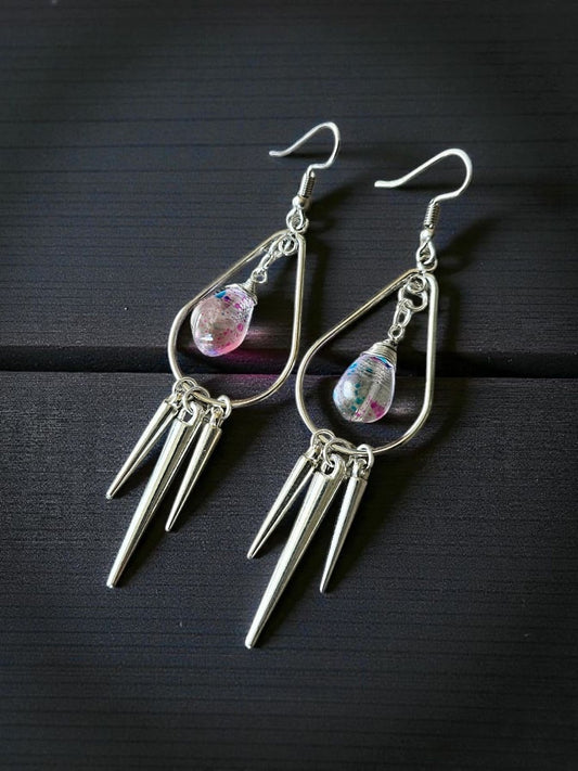 Silver Spikes on Silver Teardrops with Blue and Pink Glass Dangles Dangle Earrings