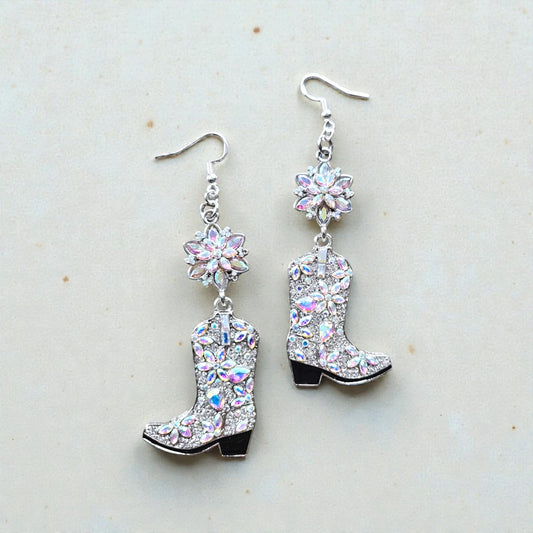 Super Blingy Rhinestone Flower and Cowboy Boot Long Dangle Earrings
