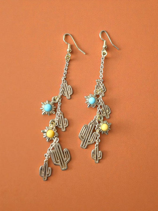 Extra Long Golden Cactus Charms on Chain with Colorful Sun Accents Dangle Earrings