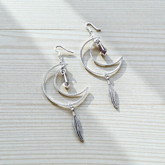 Large Silver Crescent Moons with Suncatcher Crystal Point Charms and Upcycled Feather Charms Large Dangle Earrings