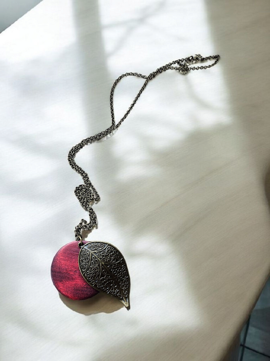 Bronze Leaf And Burgundy Wooden Circle Necklace With Long Bronze Chain For Chic Boho Style Jewelry