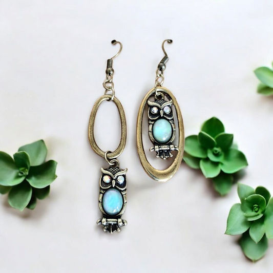 Upcycled Brass Owl Dangle Earrings Asymmetrical Handcrafted Sustainable Jewelry Gift For Eco Conscious Women