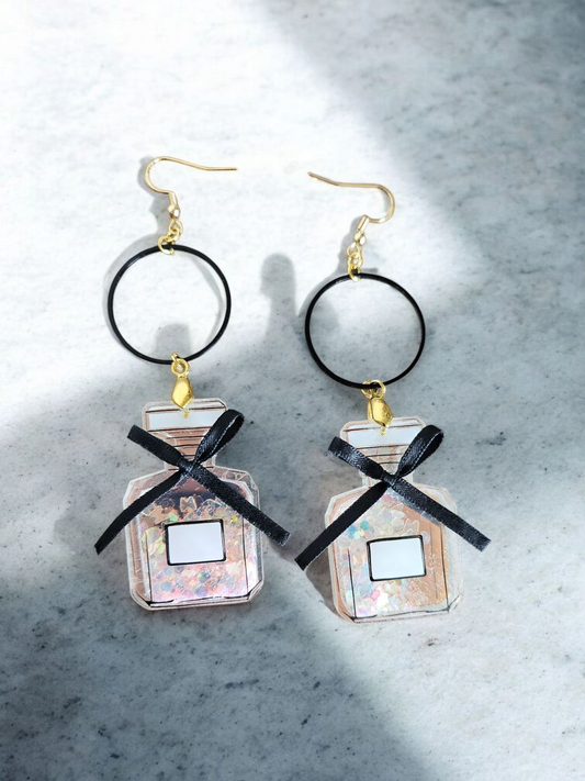 Black And Shimmer Perfume Bottle Long Dangle Earrings With Glitter Flecks For Elegant Evening Wear