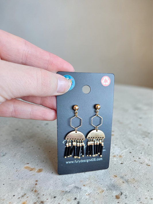 Upcycled Boho Black Bead Tassel Earrings on Golden Geometric Studs