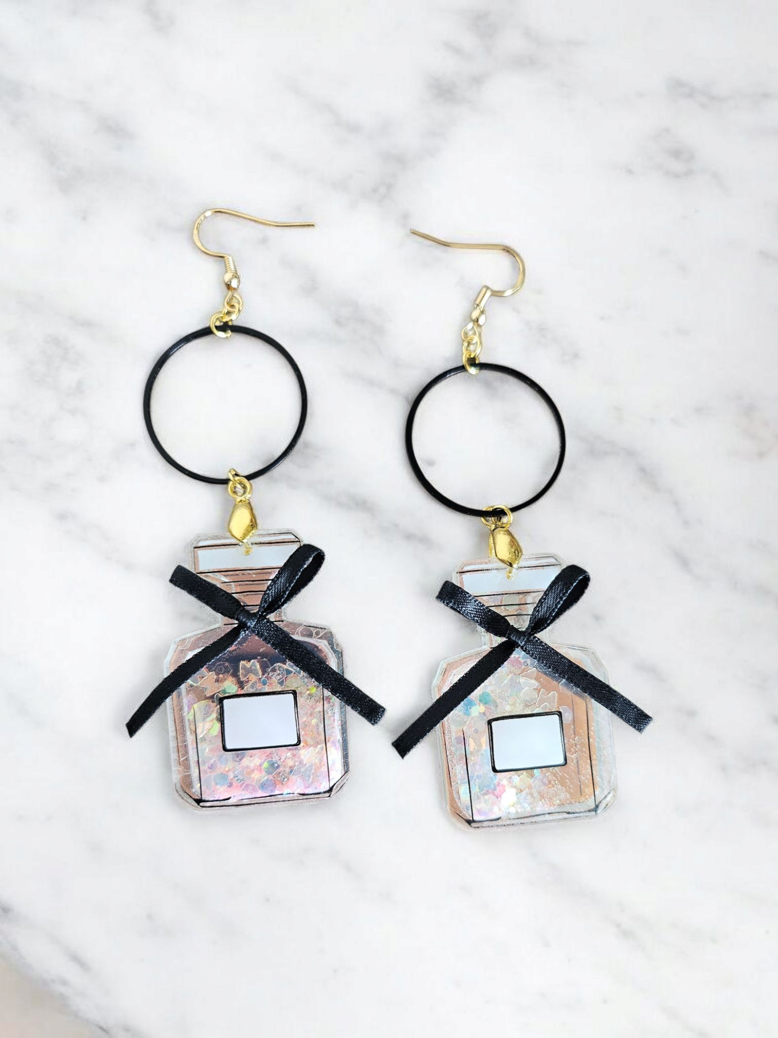 Black and Shimmer Perfume Bottle Long Dangle Earrings