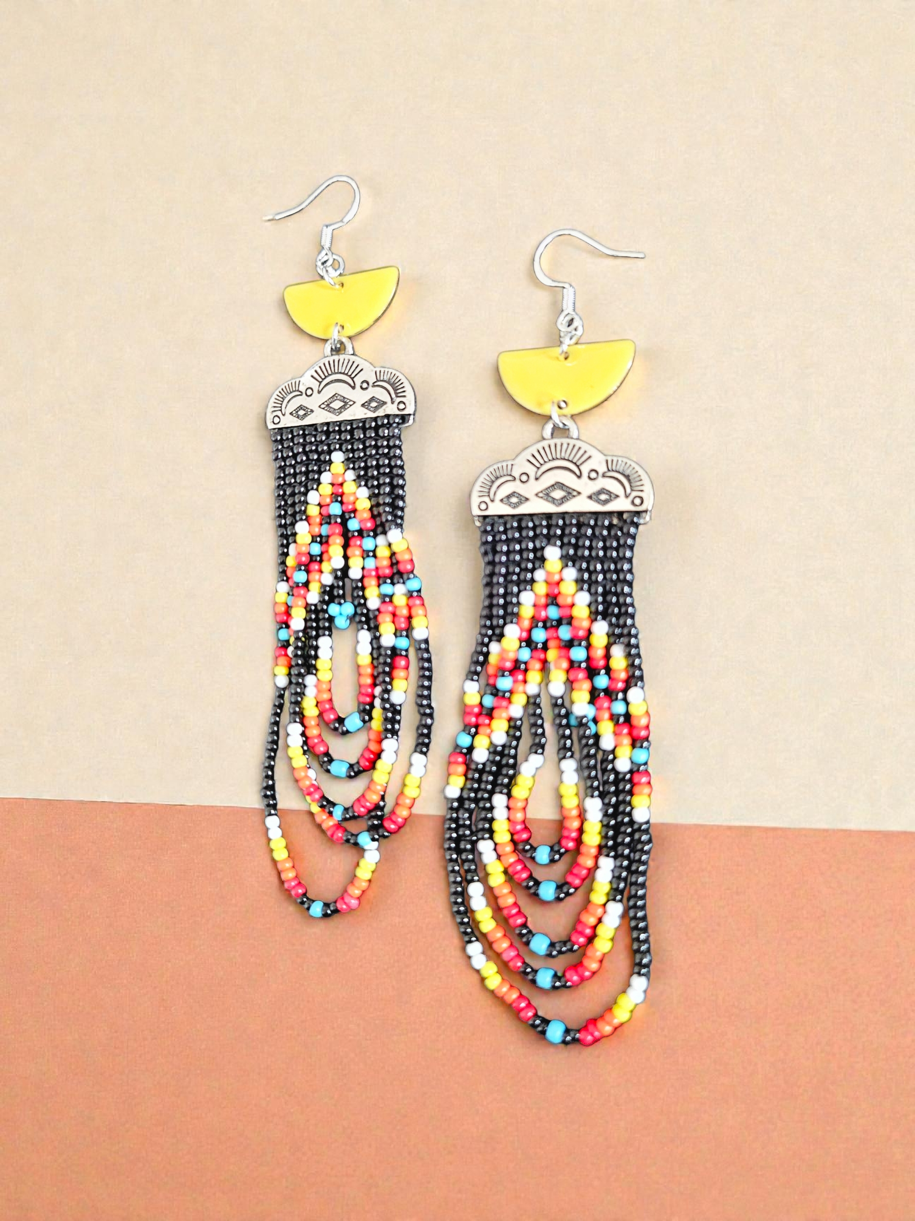 These earrings feature vibrant Western beading on a sunny yellow backdrop, designed to enhance any outfit. The dangle style offers a unique aesthetic while ensuring a lightweight wear, making them suitable for extended use. Ideal for those seeking a blend of color and cultural craftsmanship in their accessories.