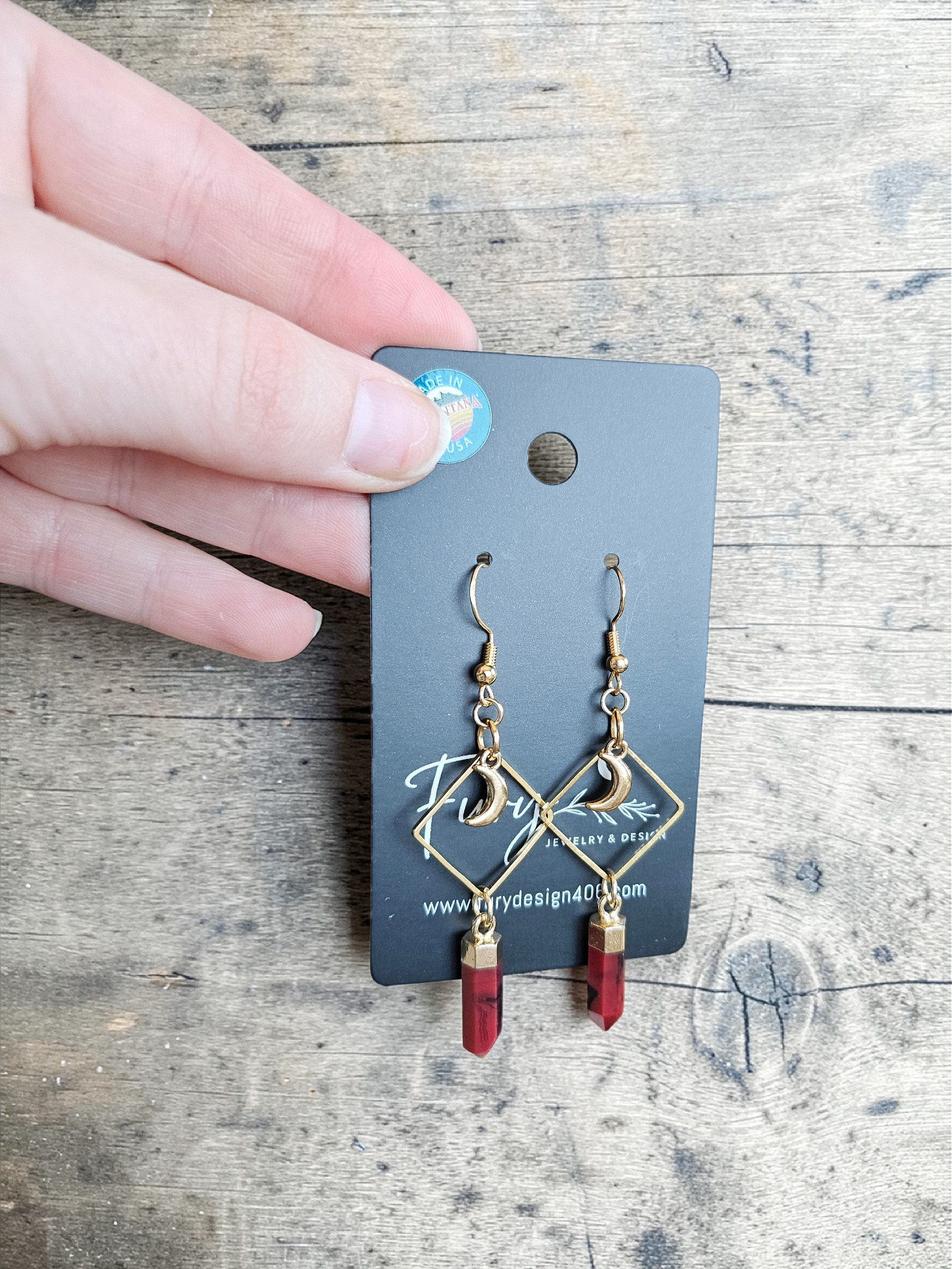 Red Jasper Points on Geometric Gold Dangle Earrings with Moons feature striking natural stone accents paired with modern metalwork. Each earring showcases a polished red jasper point suspended from delicate geometric gold elements adorned with crescent moon details. The warm tones of the jasper complement the lustrous gold finish, creating an elegant piece that blends earthy elegance with contemporary design. Perfect for those who appreciate meaningful gemstones and distinctive jewelry that makes a statement.