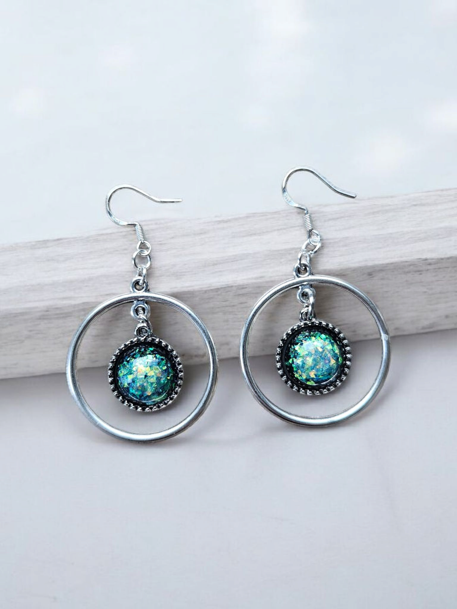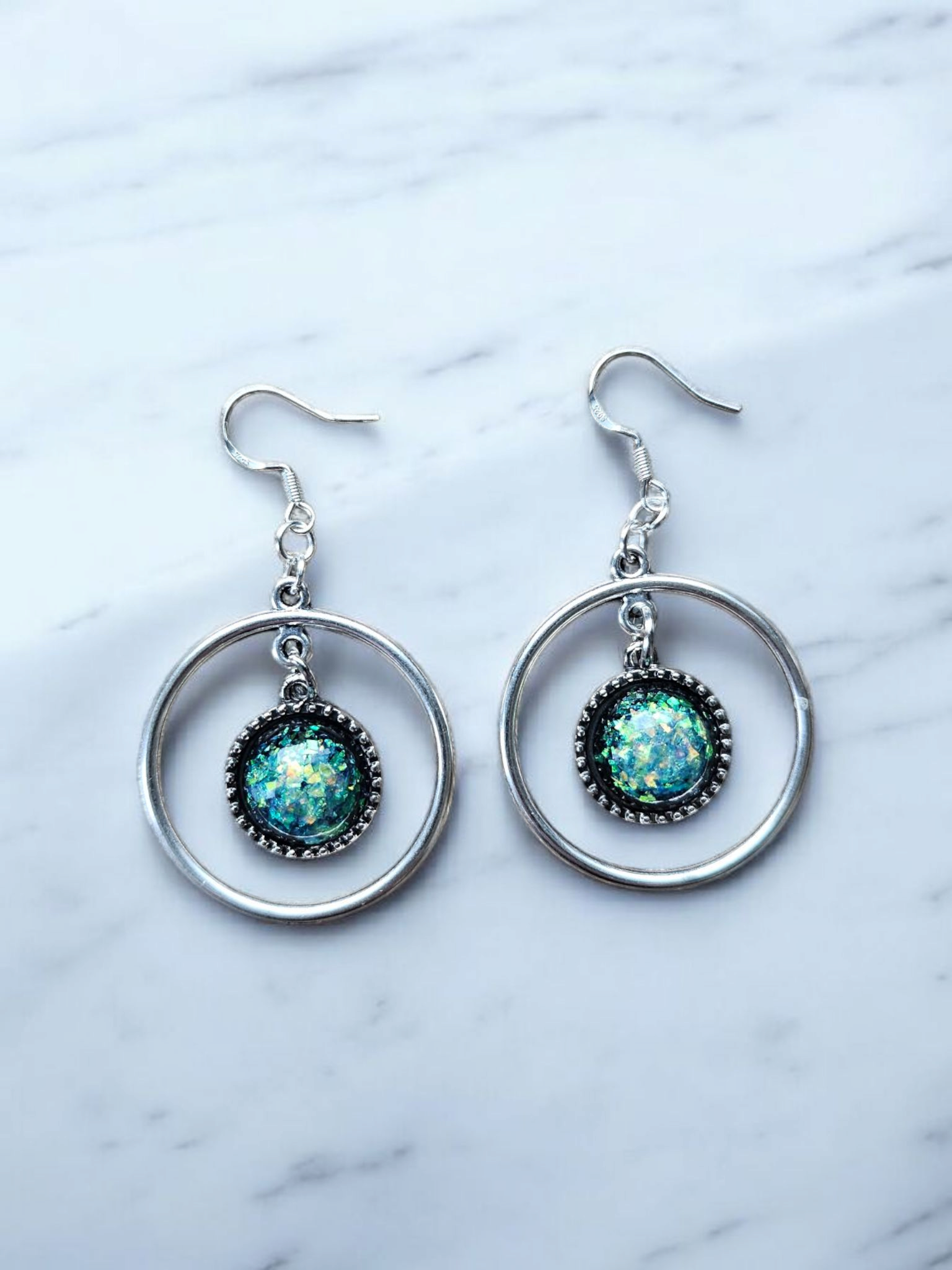 Enhance your style with our Silver Circles with Holographic Drops Dangle Earrings. The silver circles add a touch of elegance while the holographic drops add a unique and modern twist. These dangle earrings are perfect for adding a touch of glamour to any outfit.