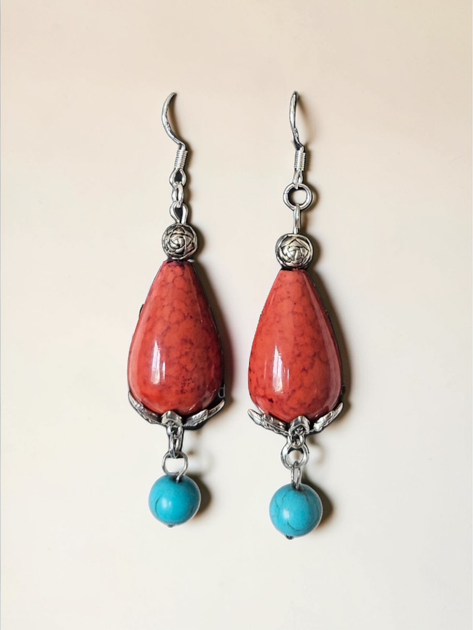 Handcrafted dangle earrings featuring upcycled marbled orange teardrop beads paired with vibrant turquoise accents and polished silver details. Each pair showcases a unique color blend, making them a one-of-a-kind addition to any jewelry collection. The lightweight design ensures comfortable all-day wear, while the artisan craftsmanship brings warmth and character to your everyday look or special occasions.